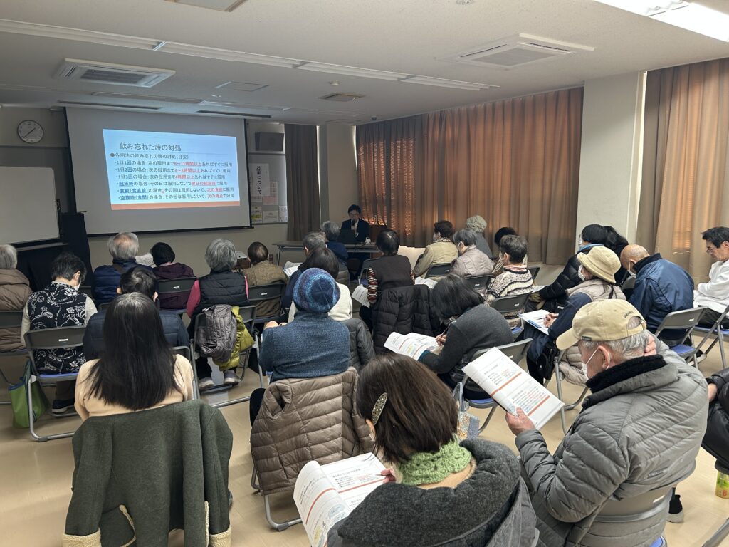 飲み忘れた時の対応や、介護の場面で多くのご質問を頂戴する高血圧、糖尿病、パーキンソン病の薬の飲み忘れの際の注意点などについてお話をさせていただきました。また、血液をサラサラにする薬や利尿剤も薬局で多くのご質問を頂戴することが多いので、気を付けていただきたいポイントをお話させていただきました。日ごろ服用されている薬でも、正しい飲み方、使い方をしないと副作用や効き目が強く現れてしまうことがあります。薬をもらわれる際はしっかりと説明を聞いていただき、正しく薬を服用してください。